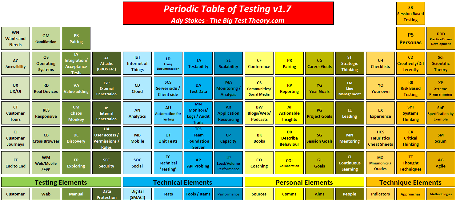 Release Notes: Digital (Technologies) (SMACI) sub category added to Technical Elements. Methodologies added to Technique Elements. AU Element updated to 'Automation for Testing' in my opinion a more open and generalise element name than Automated Testing/Checking. Also added version number (not sure if that will stay), my name and website for reference if it gets shared separately.